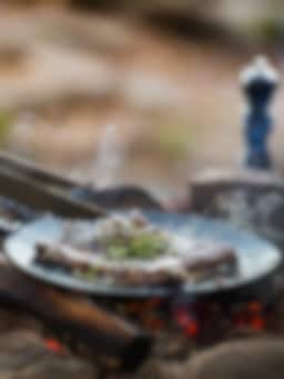 Det ska inte behöva vara krångligt att ge sig ut och laga lite god mat på semestern. Hällmark erbjuder allt ifrån små hällar till vedkök och kolarpannor. Våra ambassadörer Ida och Joe (@iskogochmark) vill inspirera fler till att ge sig ut tillsammans med familj och vänner. Här används kolarpannan (28 cm) och jägarpannan (21 cm) för att laga en god middag och dessert över öppen eld. Det fungerar jättebra att steka på sitt kött på detta vis, att få till en bra hetta som man behöver för en fin stekyta är enkelt och pannorna är små och smidiga att arbeta med, passar både för vuxna och barn. Här tillagas entrecote i rikligt med smör, salt, peppar och timjan och till dessert rostad granola med honung, jordgubbar med lime och vaniljsås. Riktig semestermat helt enkelt!