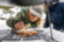 Eldgaller för att göra upp eld på snö eller på is. Med hjälp av de fyra snöankarna håller sig gallret plant och elden förhindras från att sjunka ner i underlaget och dö ut. Gallret är kompatibelt med vår eldställning, vilket gör det möjligt att använda kaffepanna eller våra hällar. Gallret förvaras och transporteras ihop vikt i förvaringsväskan. Storlek utfällt är 44 x 44 cm.