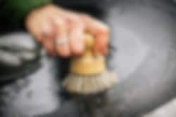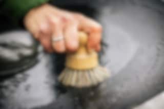 Diskborste i trä. Liten, praktisk och packbar med ett grepp som ger kraft. Våra hällar ska hanteras på samma sätt som en stekpanna i gjutjärn. Värm lite vatten i hällen så släpper matresterna enkelt med hjälp av borsten. Olja gärna in pannan efter användning. Använd inte diskmedel. Storlek 6×6 cm.
